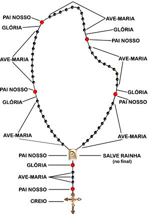 Pai Nosso: "Pai Nosso que estais no Céu, santificado seja o vosso nome; venha a nós o vosso reino; seja feita a tua vontade, assim na terra como no Céu; o pão nosso de cada dia dai-nos hoje; perdoai as nossas ofensas, assim como nós perdoamos a quem nos tem ofendido; e não nos deixeis cair em tentação, mas livrai-nos do mal. Amém."
